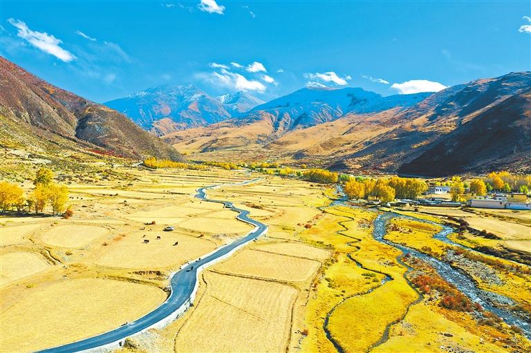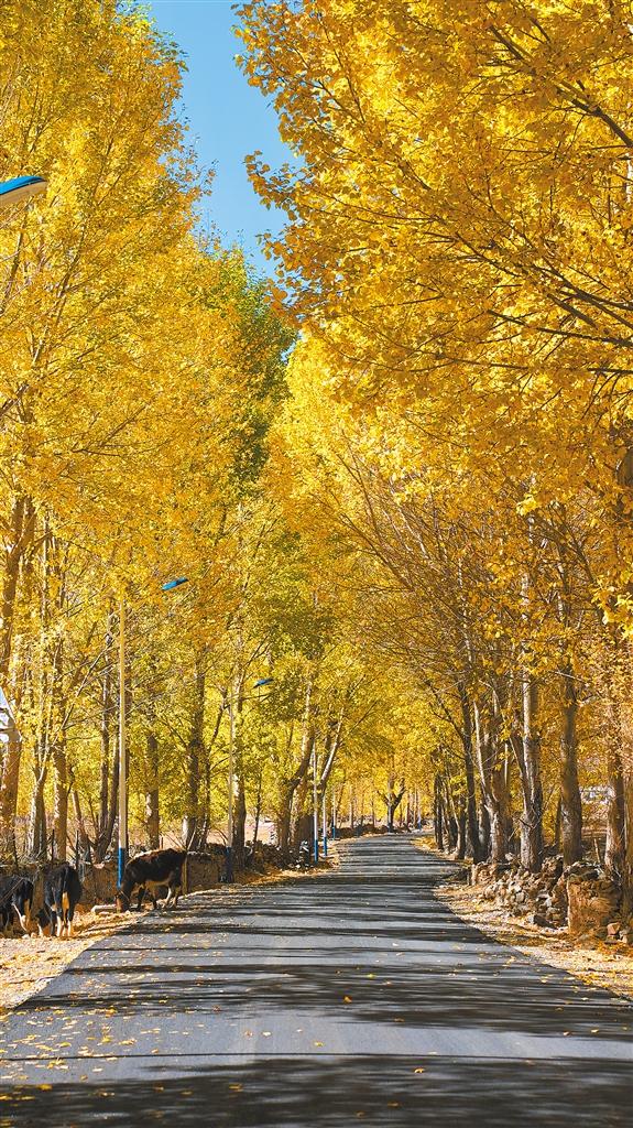 不僅如此,不管是往北通向唐嘎鄉(xiāng)的路,還是往南通向章多鄉(xiāng)的路,或是通往各個(gè)村莊的路,都在爭(zhēng)先恐后地訴說(shuō)著金秋的美麗。道路兩旁聳立著金黃色的楊樹(shù),陽(yáng)光透過(guò)樹(shù)葉,散落在道路上,一種靜謐而淡然的美,劃過(guò)車窗。