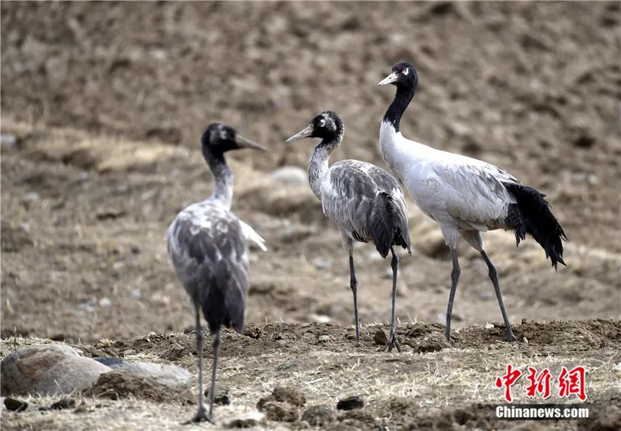 國家一級重點保護(hù)野生動物黑頸鶴在西藏拉薩楚布溝的農(nóng)田覓食。李林 攝