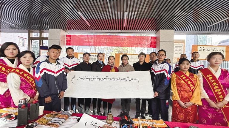 隨后,與會領(lǐng)導(dǎo)向江蘇實驗中學贈送了150套民族團結(jié)進步教育讀本。大家一同觀看了書畫社同學現(xiàn)場進行的民族團結(jié)進步書畫作品創(chuàng)作。中國書協(xié)會員、自治區(qū)政協(xié)委員、拉薩市政協(xié)常委、區(qū)市書協(xié)副主席南杰旺扎現(xiàn)場創(chuàng)作了“鑄牢中華民族共同體意識”的藏文書法橫幅贈送給江蘇實驗中學。