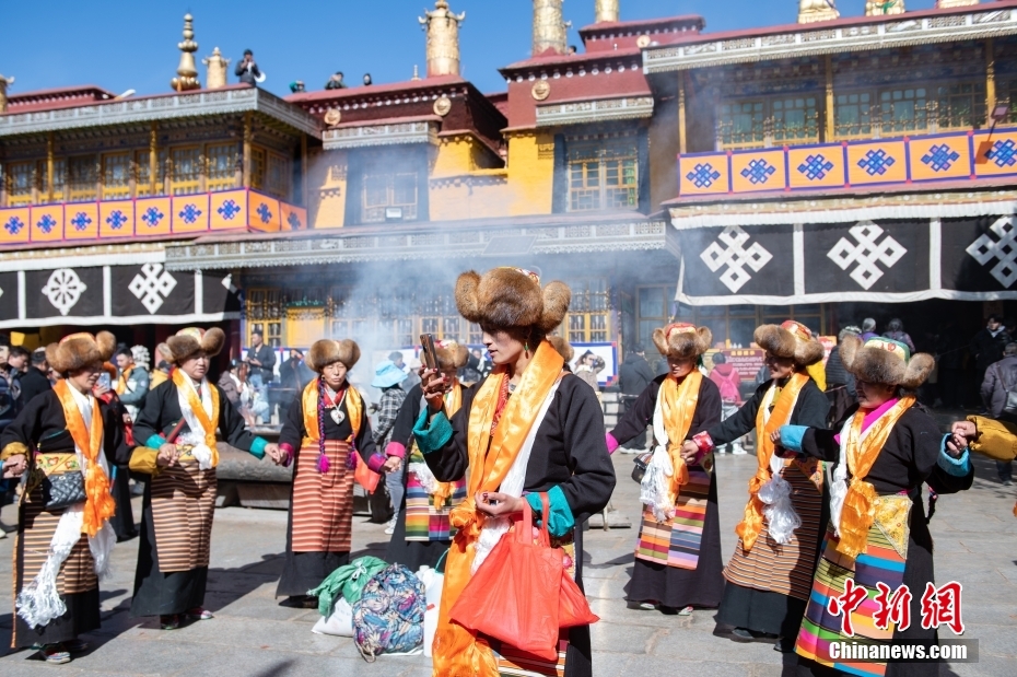 11月15日,西藏拉薩,拉薩婦女在扎基寺跳起傳統(tǒng)舞蹈,迎“仙女節(jié)”?!跋膳?jié)”即吉祥天母節(jié),藏語稱“白來日追”。相傳藏傳佛教最高護(hù)法神之一班丹拉姆的女兒白拉姆,不顧母親的反對與赤尊贊私定終身,班丹拉姆一怒之下將赤尊贊趕到拉薩河南岸,規(guī)定二人僅每年的藏歷十月十五日相見。中新社記者 貢嘎來松 攝