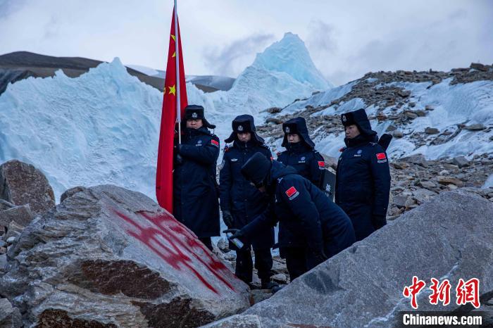 圖為普瑪江塘邊境派出所民警在海拔5600米的崗布冰川噴涂中國(guó)。郭遠(yuǎn)敬 攝