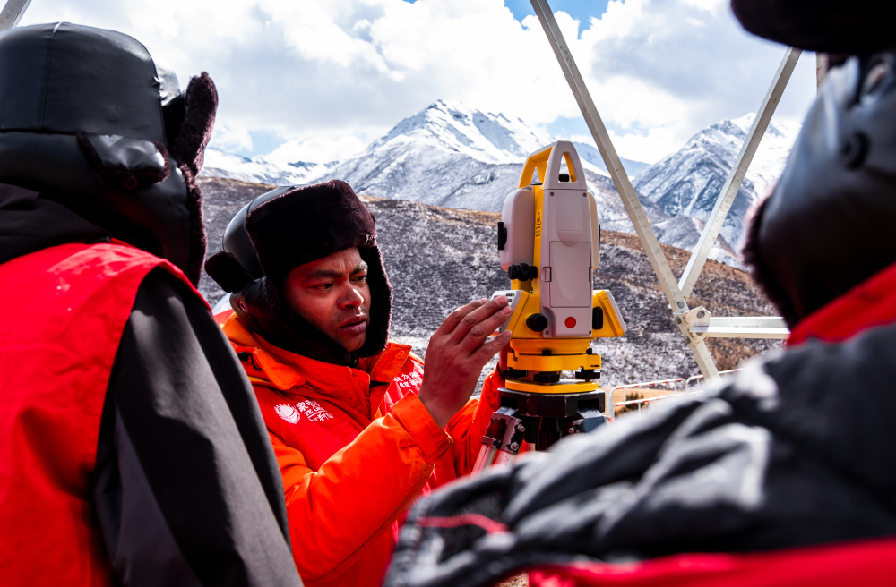 索縣榮布至丁青縣巴達(dá)35千伏線路工程負(fù)責(zé)人黃小洪在現(xiàn)場開展線路弧測量教學(xué)。(趙清鵬 攝)