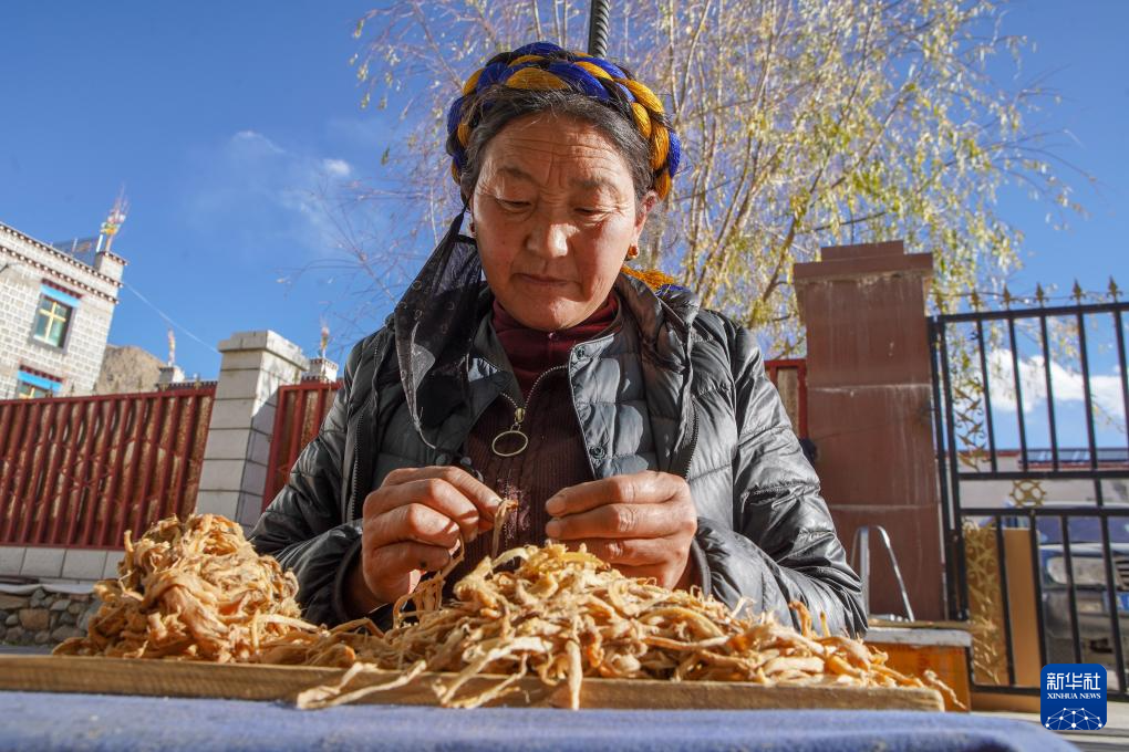 尼木縣塔榮鎮(zhèn)雪拉村村民在給狼毒草去皮,這是制作藏紙的步驟之一(12月5日攝)。新華社記者 邵澤東 攝