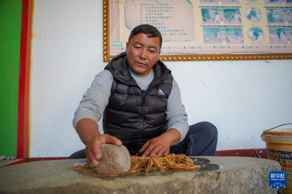 格桑旦增的弟弟普瓊用石頭捶打狼毒草,這是制作藏紙的步驟之一(12月5日攝)。新華社記者 關明輝 攝