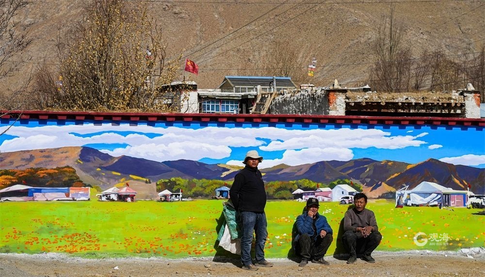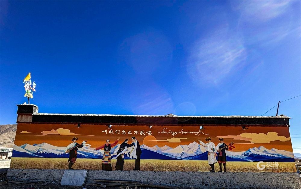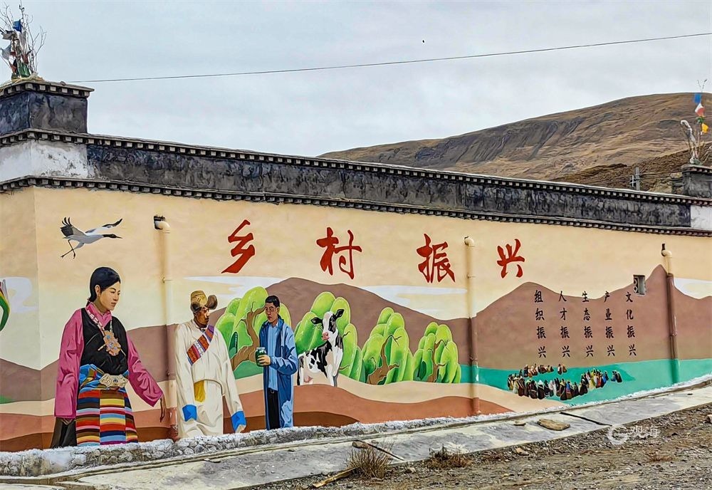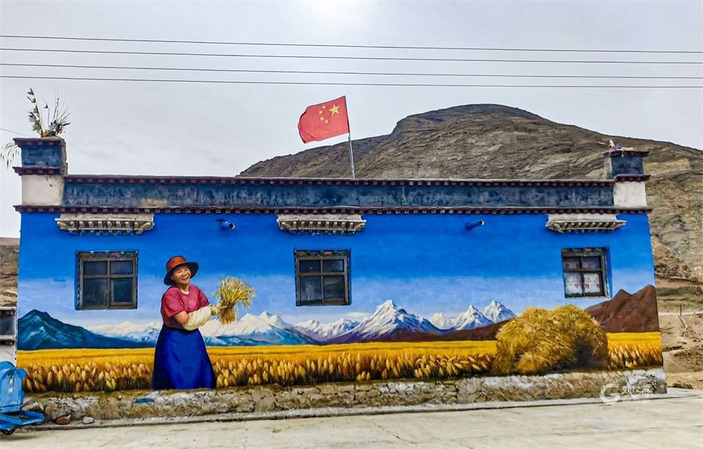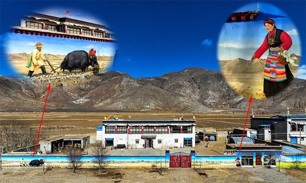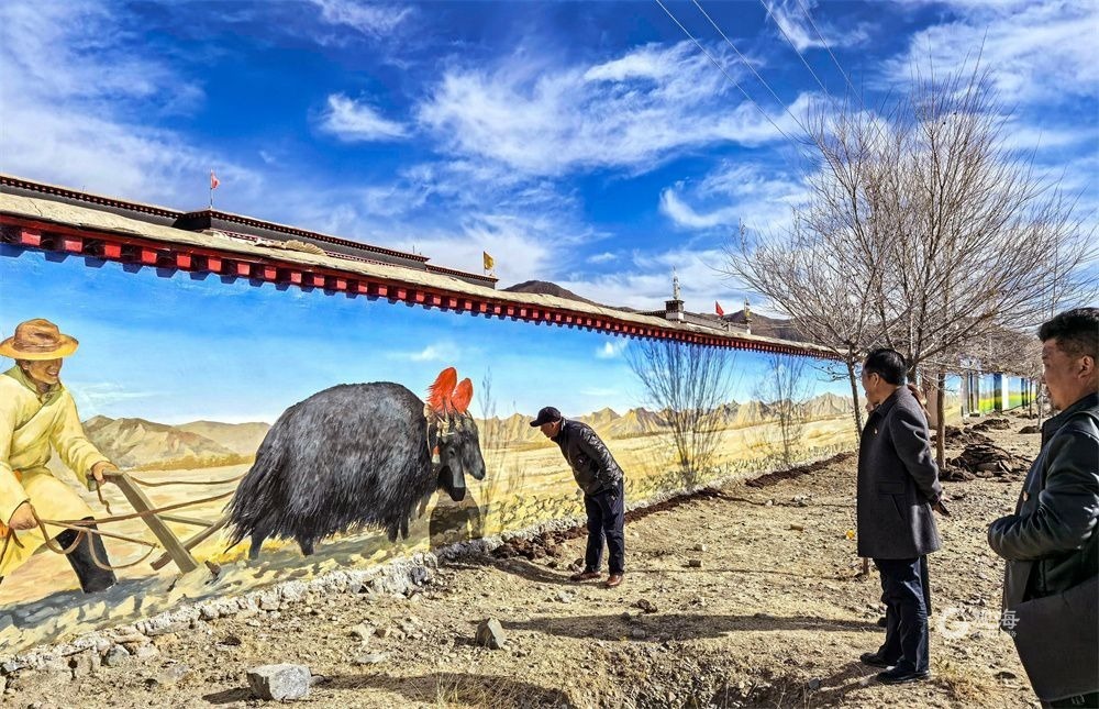 廣袤的高原上,在連綿起伏的山巒之下,是藏族農(nóng)家趕著傳統(tǒng)的“二牛抬杠”耕耘的場景,旁邊的“阿佳”則撒下希望的青稞種子……這樣的場景當(dāng)然不會出現(xiàn)在現(xiàn)在這個滴水成冰的季節(jié),而是躍然于藏家傳統(tǒng)村居的院墻之上?!拔壹疫@面墻原來就是貼滿了牛糞,現(xiàn)在畫上了我們平時勞動的景象,感覺比之前更好看了?!鄙V樽螀^(qū)東嘎鄉(xiāng)色定村的村民旦瓊說,此前的一年又一年,他都是把牛糞貼在墻上,固然有傳統(tǒng)的高原美感,但是與現(xiàn)在院墻上畫的鄉(xiāng)村振興的場景相比,還是現(xiàn)在的感覺更不錯。