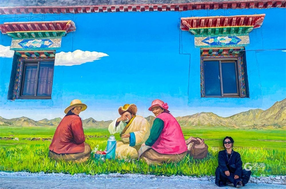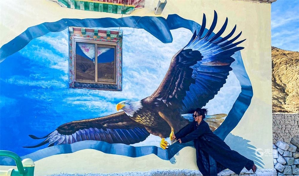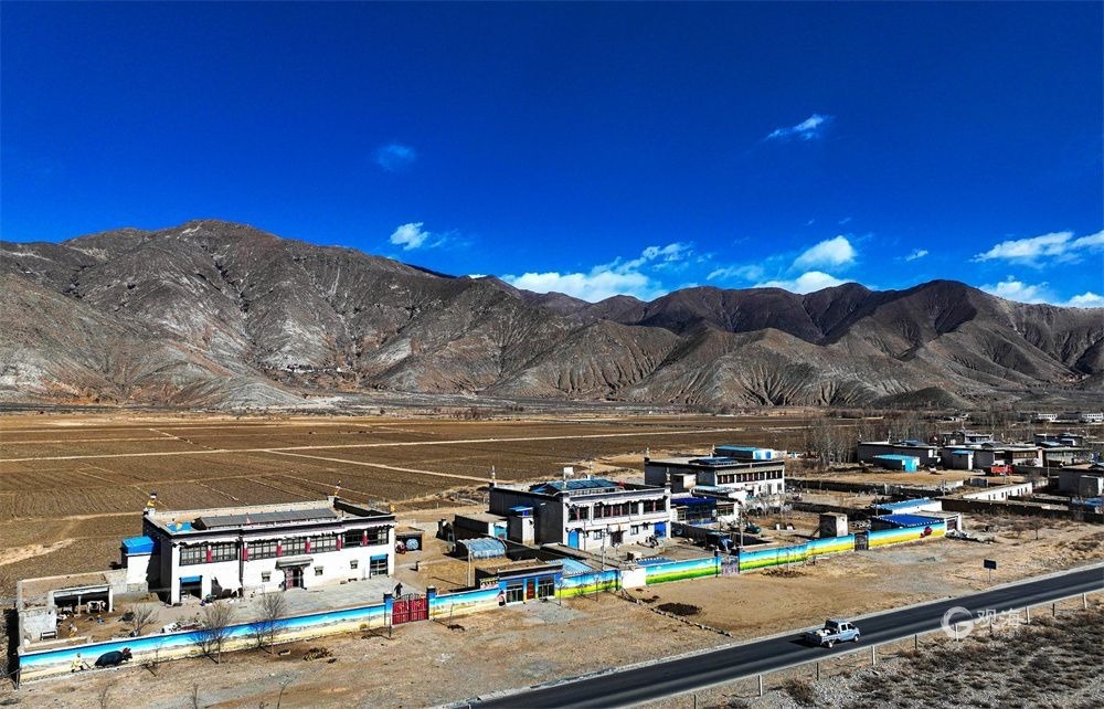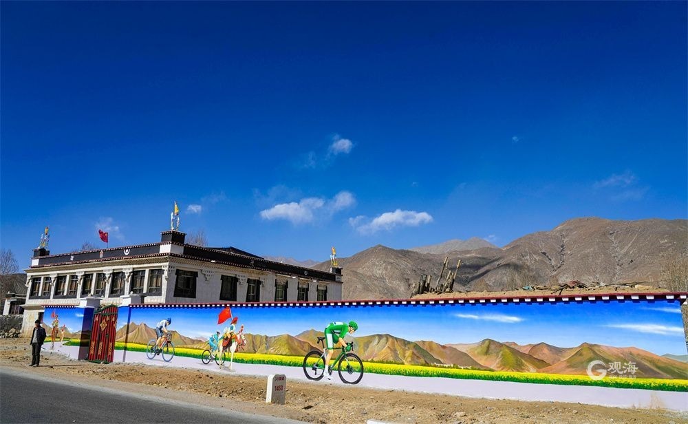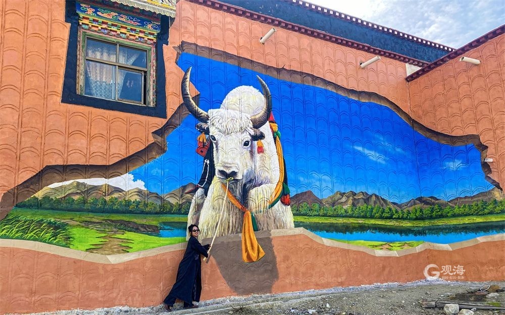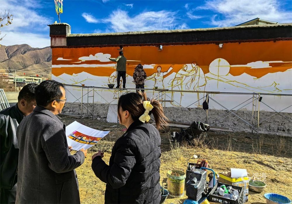 廣袤的高原上,在連綿起伏的山巒之下,是藏族農(nóng)家趕著傳統(tǒng)的“二牛抬杠”耕耘的場景,旁邊的“阿佳”則撒下希望的青稞種子……這樣的場景當(dāng)然不會出現(xiàn)在現(xiàn)在這個滴水成冰的季節(jié),而是躍然于藏家傳統(tǒng)村居的院墻之上?!拔壹疫@面墻原來就是貼滿了牛糞,現(xiàn)在畫上了我們平時勞動的景象,感覺比之前更好看了?!鄙V樽螀^(qū)東嘎鄉(xiāng)色定村的村民旦瓊說,此前的一年又一年,他都是把牛糞貼在墻上,固然有傳統(tǒng)的高原美感,但是與現(xiàn)在院墻上畫的鄉(xiāng)村振興的場景相比,還是現(xiàn)在的感覺更不錯。