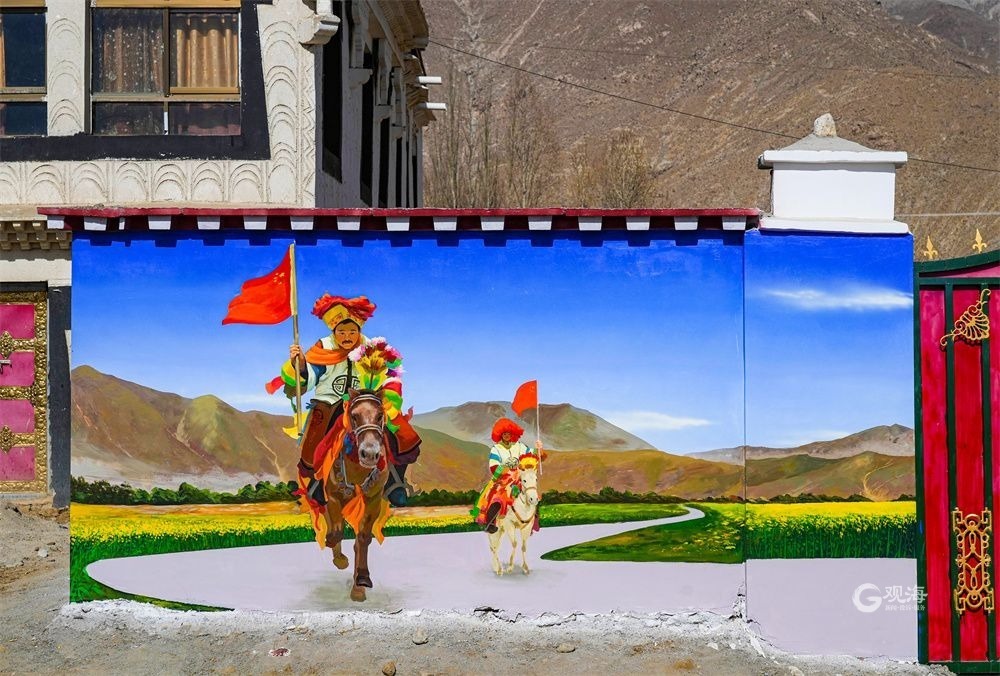 鄉(xiāng)村振興、民族團(tuán)結(jié)、道路安全、移風(fēng)易俗、傳統(tǒng)文化、現(xiàn)代文明、高原特色……各式各樣的場景,現(xiàn)在已經(jīng)出現(xiàn)在了桑珠孜區(qū)東嘎鄉(xiāng)、聶日雄鄉(xiāng)、曲美鄉(xiāng)、納爾鄉(xiāng)部分鄉(xiāng)村的道路兩旁。一幅幅栩栩如生的手繪墻畫,“爬上”了錯落有致的藏式小樓,“登上”了一座座藏式院落的院墻,成為一道道亮麗的風(fēng)景線。在干凈整潔的鄉(xiāng)村道路旁,錯落有致的農(nóng)家庭院上,粉刷一新的墻面上色彩艷麗的大型墻繪以直觀的畫面和村民喜聞樂見的形式,將鄉(xiāng)村振興、民族團(tuán)結(jié)、移風(fēng)易俗等內(nèi)容與農(nóng)村景觀有機(jī)結(jié)合,讓一堵堵“牛糞墻”有了新活力吸引著過往路人的目光。一幅幅栩栩如生的畫面、一段段民族團(tuán)結(jié)的故事,與鄉(xiāng)村環(huán)境融為一體,形成了“村中有畫、畫中有村”的整體風(fēng)貌;一面面文明和諧、多彩絢麗的彩繪墻,猶如一張張靈動的文明標(biāo)簽,將黨的方針政策、藏族同胞的幸福生活活靈活現(xiàn)地展示在墻上,不僅扮靚了鄉(xiāng)村美景,也傳遞了向上向善向美的正能量,處處都能讓人感受到美麗鄉(xiāng)村文明發(fā)展的濃郁氣息。
