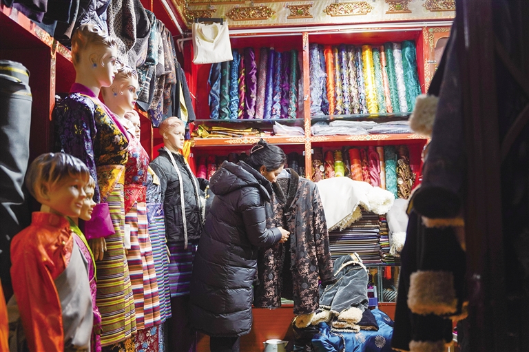 “最近越來越冷了,所以我今天來給女兒買一件厚點(diǎn)的藏裝,剛好她生日也快到了?!弊哌M(jìn)位于北京東路的222藏裝店,琳瑯滿目、顏色絢麗的冬款藏裝讓人眼前一亮,市民尼瑪拉姆正在給女兒挑選藏裝。一旁,店員則在給客人測(cè)量三圍、取藏裝、介紹款式,忙得不可開交。