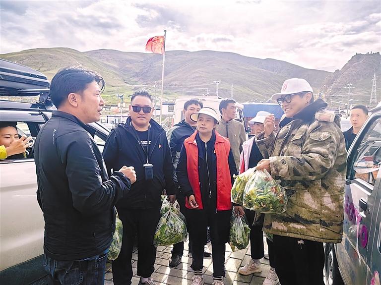 圖為薩嘎縣“紅色驛站”工作人員為騎行游客贈(zèng)送蔬菜。扎西頓珠 攝