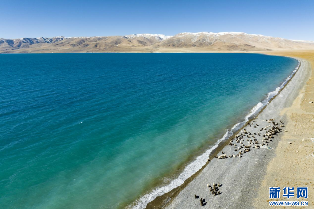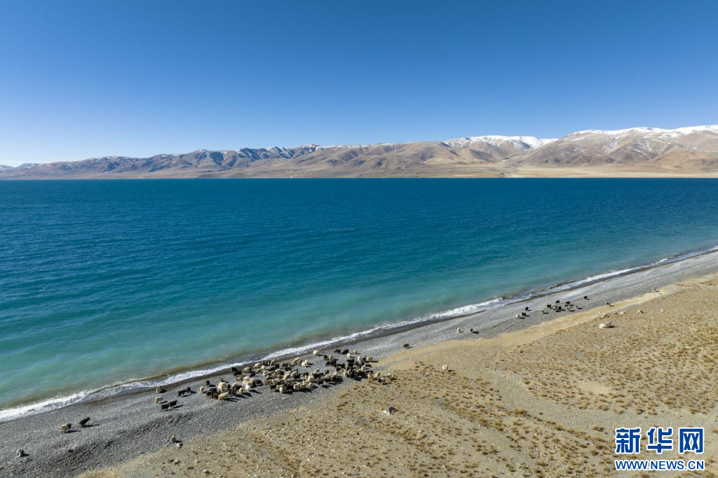 12月20日拍攝的當惹雍錯湖畔的羊群(無人機照片)。新華網(wǎng) 旦增努布 攝
