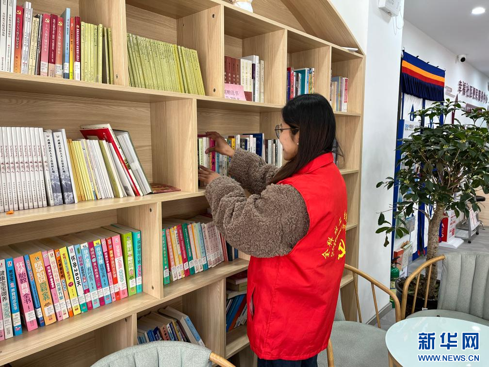 在西藏拉薩市功德林街道,幸福社區(qū)的“全科社工”強(qiáng)珍正在整理黨群服務(wù)中心的書(shū)籍(11月26日攝)。新華社發(fā)(德央 攝)