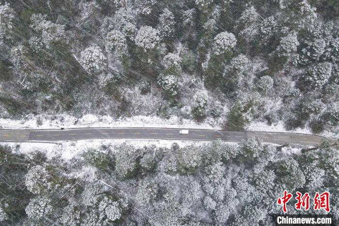 圖為12月18日,西藏林芝墨脫扎墨公路上,一車輛穿行在林海中。江飛波 攝