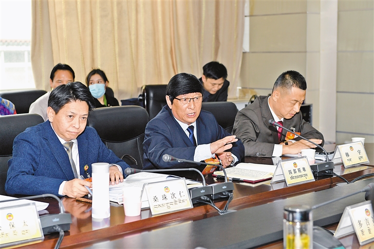 工商業(yè)聯(lián)合會(huì)界別的政協(xié)委員四郎旺堆(右)在發(fā)言。記者 旦增蘭澤 攝