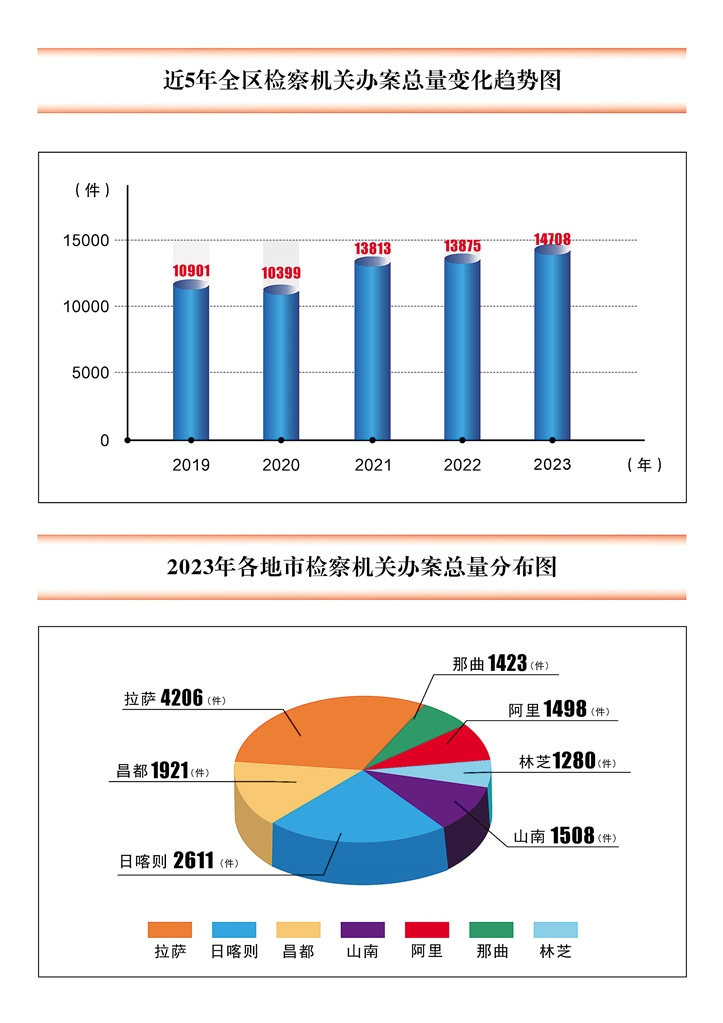 “2023年,全區(qū)檢察機關(guān)在自治區(qū)黨委和最高檢正確領(lǐng)導(dǎo)下,以習(xí)近平新時代中國特色社會主義思想為指導(dǎo),深入貫徹習(xí)近平法治思想、習(xí)近平總書記關(guān)于西藏工作的重要指示和新時代黨的治藏方略,全面貫徹黨的二十大精神、自治區(qū)第十次黨代會和十屆區(qū)黨委歷次全會精神、全國檢察長會議精神,認真落實自治區(qū)十二屆人大一次會議決議,自覺把檢察工作放到黨的治藏穩(wěn)藏興藏大局中謀劃推進,聚焦‘四件大事’聚力‘四個創(chuàng)建’,忠誠依法能動高質(zhì)效履職取得新成效。全年辦理各類法律監(jiān)督案件14708件,同比增長6%。依法主動辦案8030件,占54.6%,主動辦案量首次超過被動受理案件量。‘四大檢察’結(jié)構(gòu)持續(xù)優(yōu)化為56∶18∶7∶19,業(yè)務(wù)質(zhì)效穩(wěn)步提升。”1月8日下午,西藏自治區(qū)人民檢察院檢察長夏克勤在西藏自治區(qū)第十二屆人民代表大會第二次會議上作工作報告。報告全面反映了西藏檢察機關(guān)一年來始終牢記“國之大者”,以實現(xiàn)“努力讓人民群眾在每一個司法案件中感受到公平正義”為目標(biāo),深入踐行“高質(zhì)效辦好每一個案件”,充分發(fā)揮檢察職能作用,在為大局服務(wù)、為人民司法、為法治擔(dān)當(dāng)中所做的主要工作,同時描繪了2024年的西藏檢察工作藍圖。
