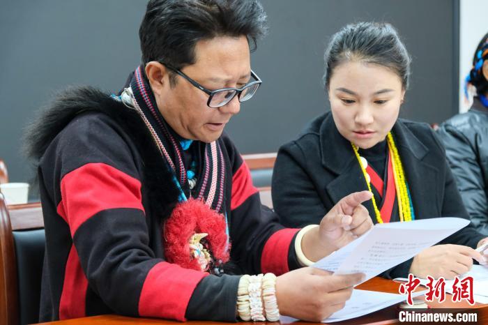 1月9日,西藏自治區(qū)兩會現(xiàn)場,兩位珞巴族政協(xié)委員林勇(左)和布姆曲珍進行討論、交流。中新社記者 江飛波 攝