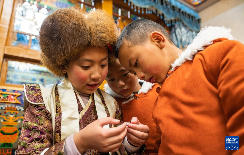 巴桑普尺家的孩子在查看“古突”里包裹的字條“餡兒”(1月10日攝)。新華社發(fā)(丁增尼達 攝)