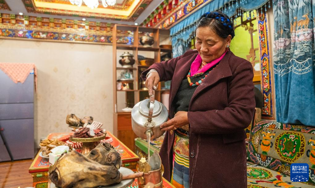 巴桑普尺在倒青稞酒(1月10日攝)。新華社發(fā)(丁增尼達 攝)