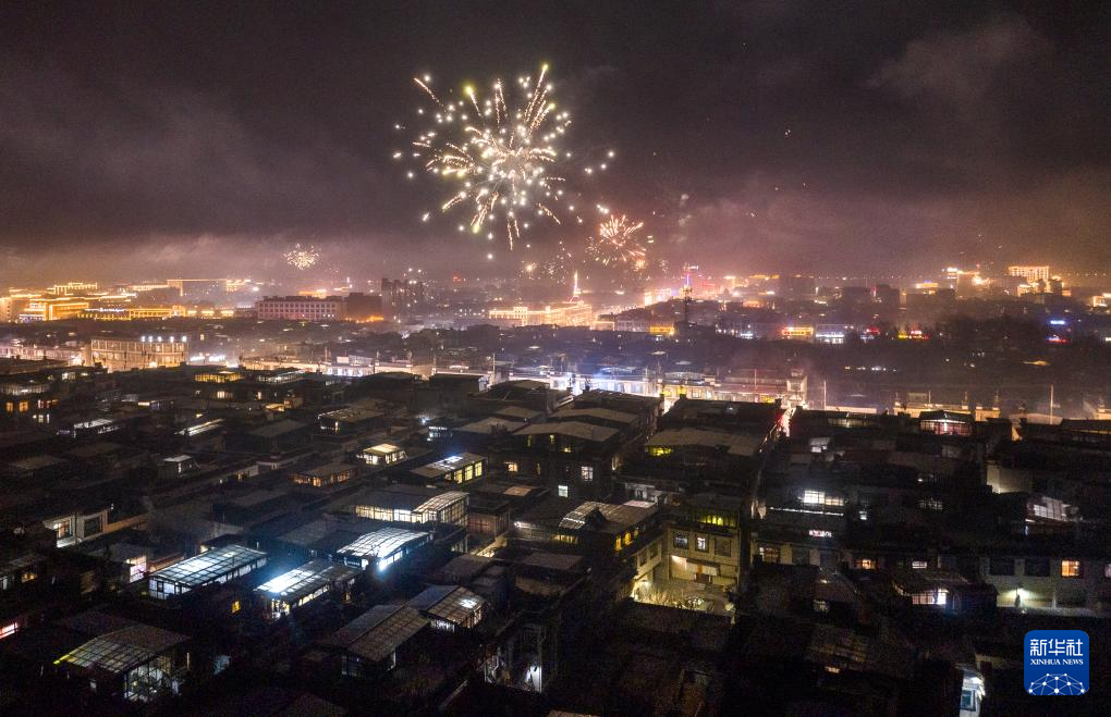 這是日喀則市桑珠孜區(qū)“古突”夜綻放的煙花(1月10日攝,無人機照片)。新華社發(fā)(丁增尼達 攝)