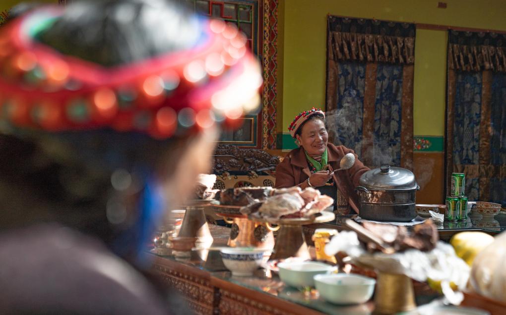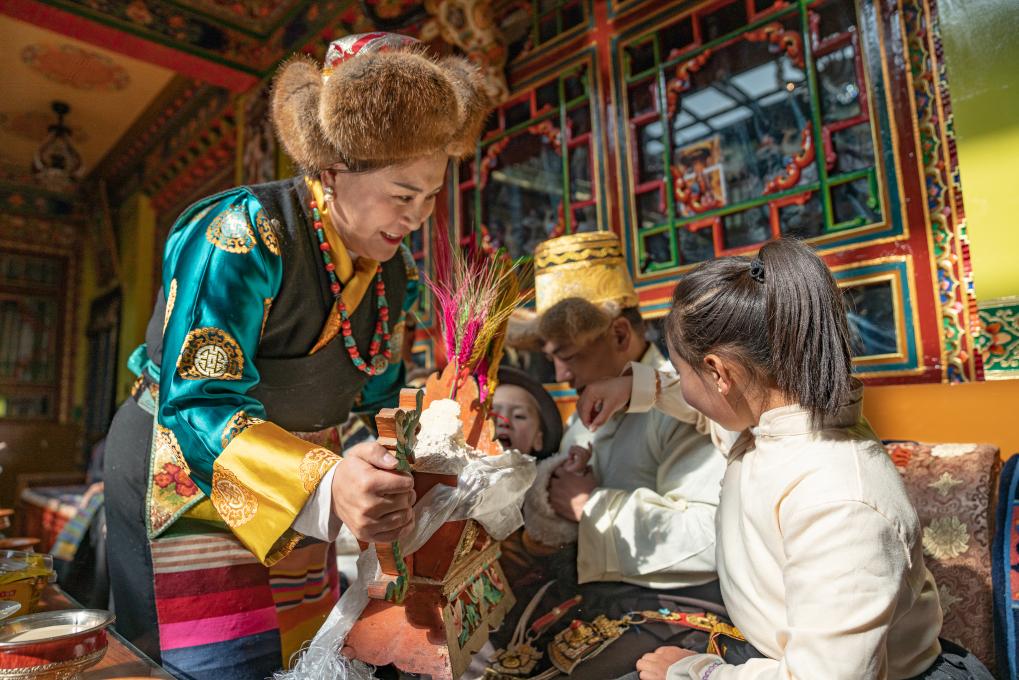 一家人按長(zhǎng)幼次序落座,女兒次仁普尺逐一為大家獻(xiàn)上切瑪,這也是新年的重要儀式,寓意五谷豐登、六畜興旺、家和萬(wàn)事興。