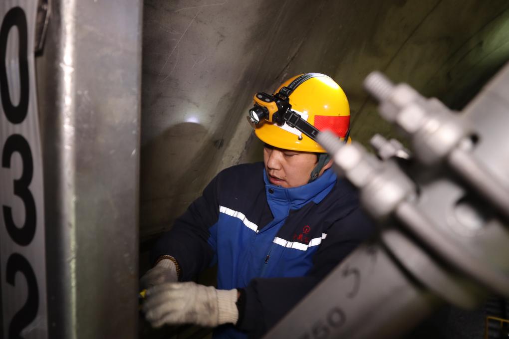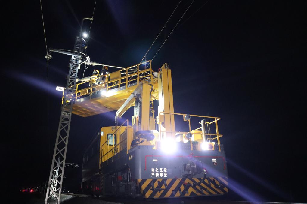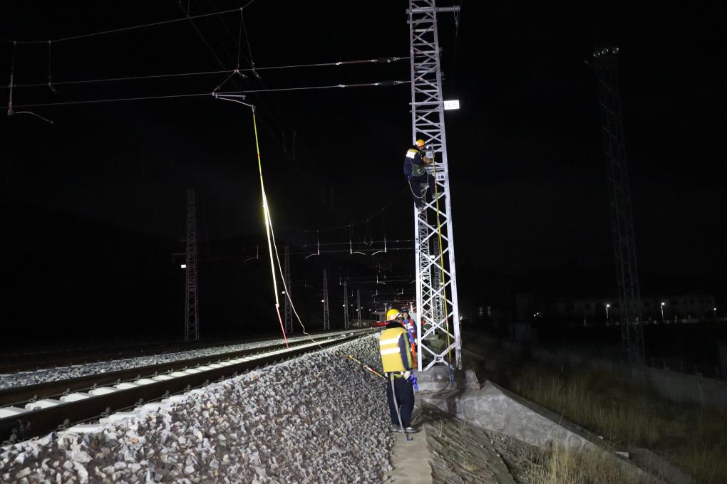 維護進行時,專用的接觸網(wǎng)軌道作業(yè)車的兩節(jié)車廂緩緩解列,分別駛向全長13公里的接觸網(wǎng)作業(yè)區(qū)段兩端。拉薩的冬夜寒風(fēng)刺骨,溫度低至零下10攝氏度,工人們穿著絕緣鞋,將兩端接觸網(wǎng)接掛地線,正式開始作業(yè)。