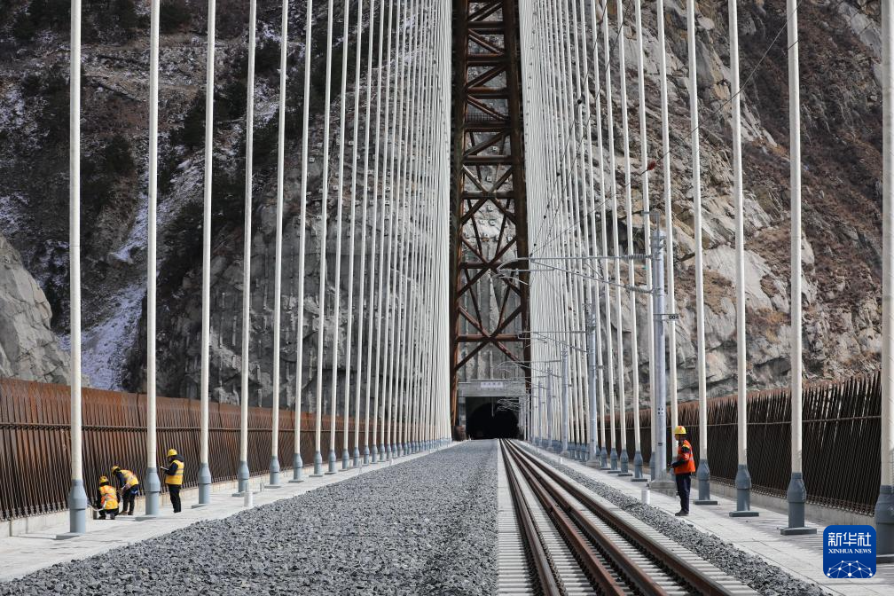 加查橋隧工區(qū)維護(hù)人員在檢查藏木特大橋的擋風(fēng)板和吊桿(1月27日攝)。新華社記者 劉洲鵬 攝