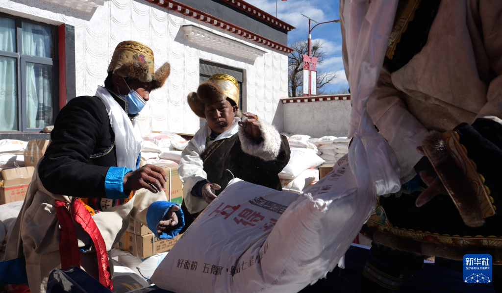 2月3日,努堆村2023年分紅大會現(xiàn)場,村民們在將分紅物資搬運上車。新華社記者 格桑朗杰 攝
