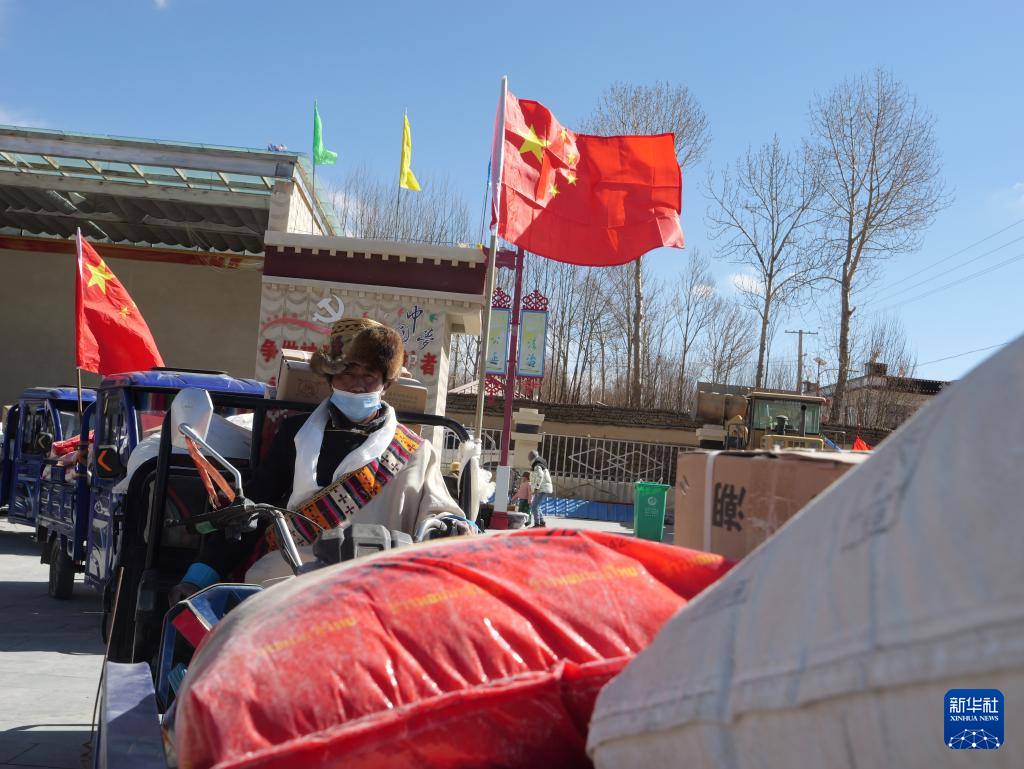 2月3日,努堆村2023年分紅大會現(xiàn)場,村民用電動三輪車將分紅物資運回家中。新華社記者 洛卓嘉措 攝