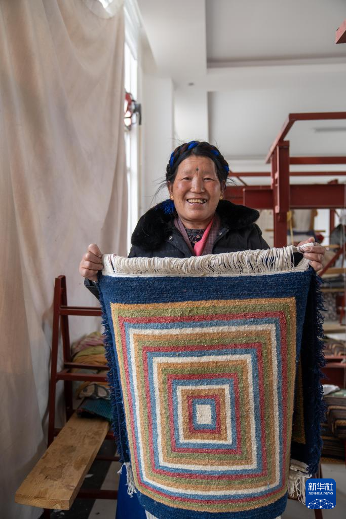 一名婦女展示自己編織的藏毯(2月22日攝)。新華社記者 旦增尼瑪曲珠 攝