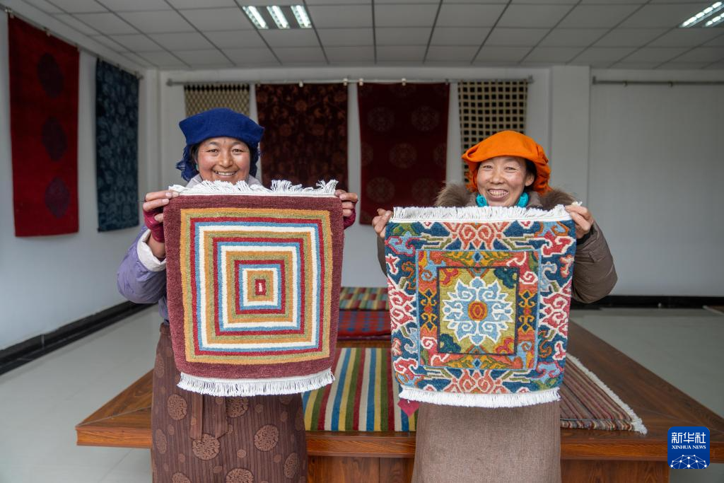 兩名婦女在展示自己編織的藏毯(2月22日攝)。新華社記者 旦增尼瑪曲珠 攝