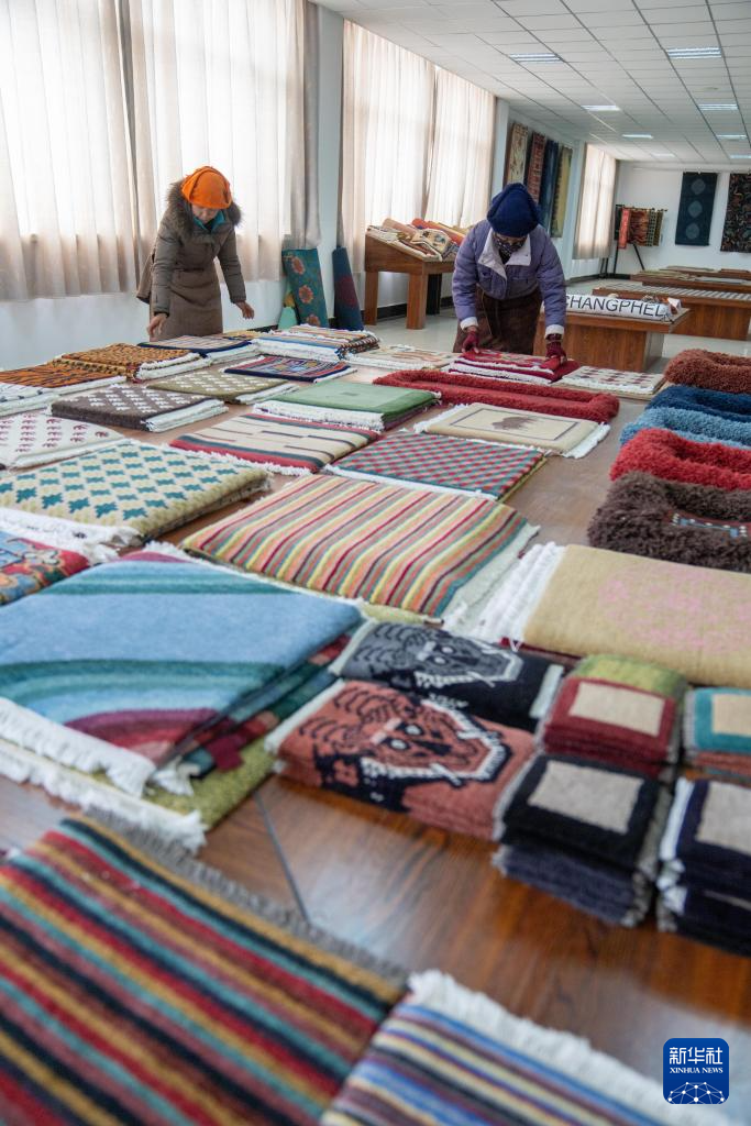 瓊結(jié)縣群眾在整理編織好的藏毯(2月22日攝)。新華社記者 旦增尼瑪曲珠 攝