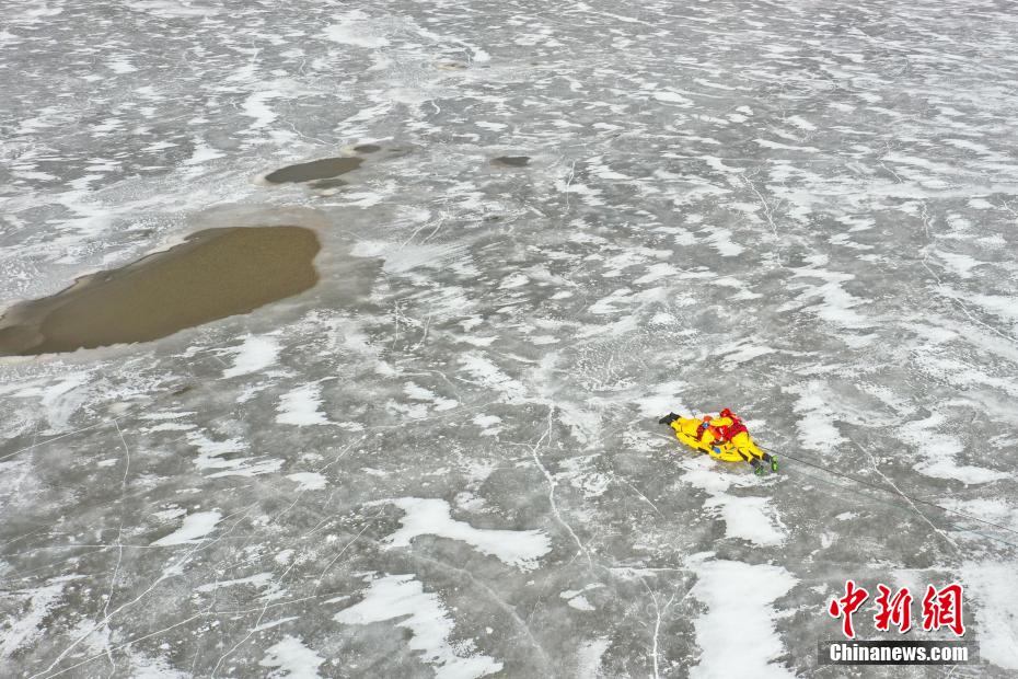圖為冰湖演練現(xiàn)場(chǎng),救援人員向“被困人員”靠近。姚天銳 攝
