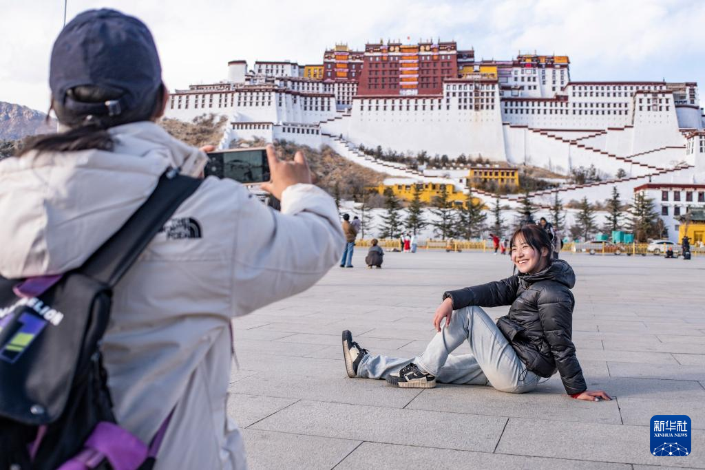 在拉薩市布達(dá)拉宮廣場上,丹增(右)正在拍照留念(2024年1月28日攝)。新華社 孫非 攝