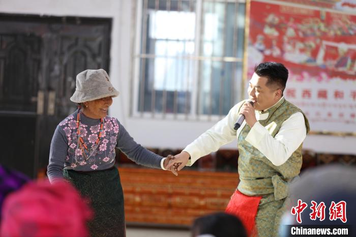 圖為演出中,西藏出入境邊防檢查總站文藝骨干與阿里地區(qū)扎西崗鄉(xiāng)群眾互動(dòng)。 胡俊浩 攝