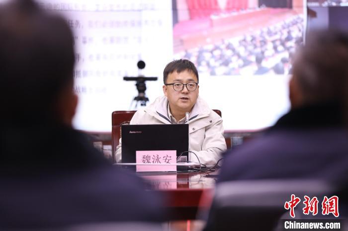 圖為四川大學(xué)馬克思主義學(xué)院魏泳安副教授通過視頻會(huì)議系統(tǒng)向阿里邊境管理支隊(duì)全體民警講授理論知識(shí)?!『『?攝