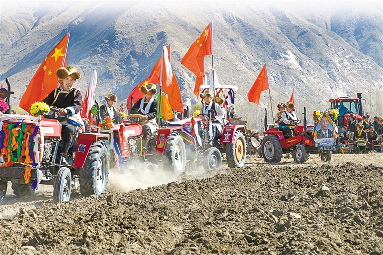 儀式中,從傳統(tǒng)的“二牛抬杠”耕作到手扶耕地機半自動犁地,再到大型旋耕機高效率深翻作業(yè),村民們用三種春耕方式依次展現(xiàn)了高原農業(yè)生產的現(xiàn)代化、機械化發(fā)展過程。