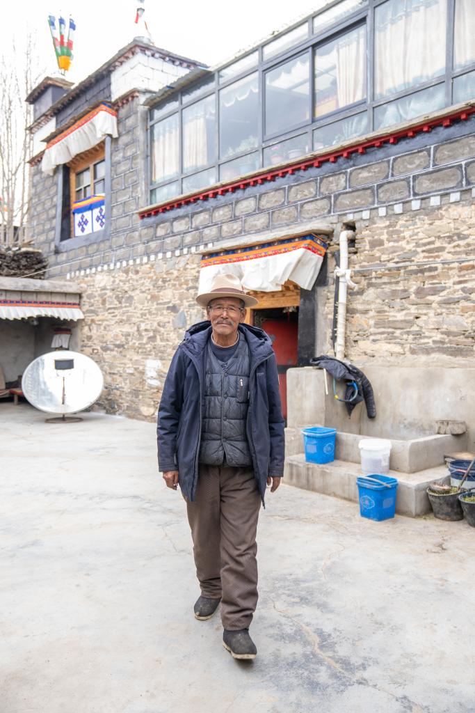 次旦說,平時二女兒央金在家照顧他的生活,女婿外出務工。次旦老人生活閑適,村里一有文藝演出,他就過去觀看。