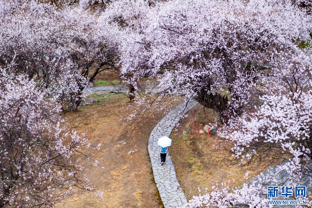 4月3日,林芝市巴宜區(qū)嘎拉村盛開的桃花(無人機照片)。新華網(wǎng) 旦增努布 攝