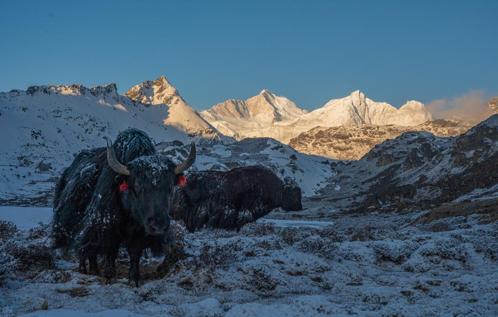 這是在嘎瑪溝中拍攝的牦牛和雪山(4月17日攝)。新華社記者 丁增尼達(dá) 攝