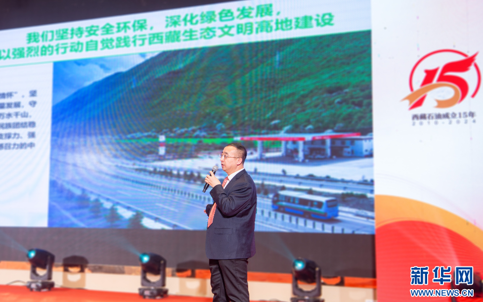 4月28日,中國石化西藏石油分公司代表、黨委書記施長春在活動(dòng)現(xiàn)場發(fā)布中國石化西藏石油社會責(zé)任報(bào)告。新華網(wǎng) 旦增努布 攝