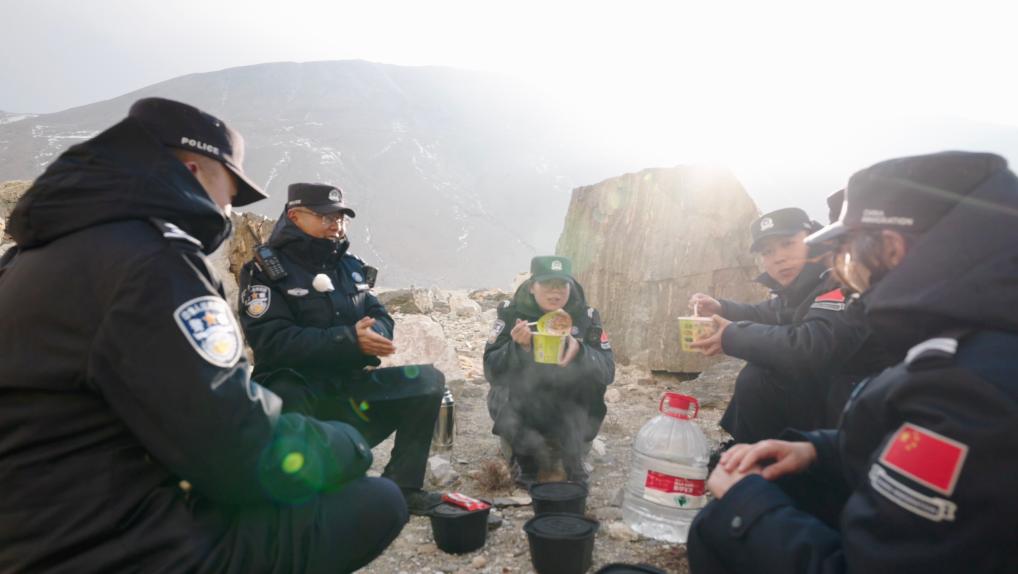 經過4個多小時的高海拔行走,巡邊隊伍終于到達了6000米的巡邏折返點位,也到了巡邏路上的快樂時刻,吃火鍋!“現(xiàn)在后勤保障到位,無論在野外何處,吃頓熱飯已不是難事”,帶隊的副所長次仁加措說道。