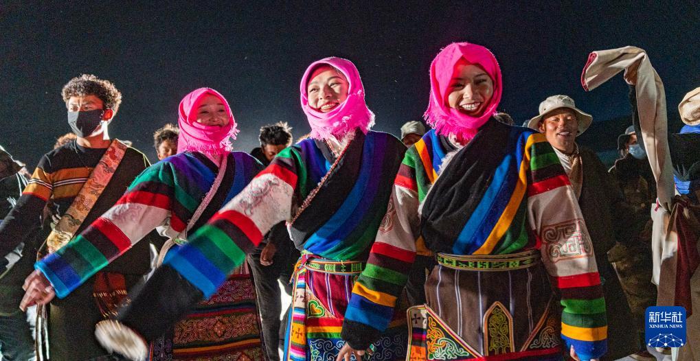 當(dāng)?shù)厝罕娫诩{木錯開湖篝火晚會現(xiàn)場跳鍋莊(5月18日攝)。新華社記者 丁增尼達 攝