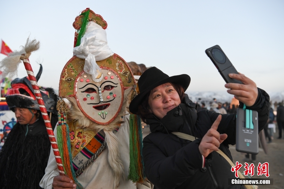5月18日晚,西藏拉薩市當(dāng)雄縣納木錯(cuò)湖畔,當(dāng)?shù)啬撩駧в慰腕w驗(yàn)篝火鍋莊舞。納木錯(cuò),被譽(yù)為“天湖”,吸引著大量游客前來(lái)觀光。圖為篝火鍋莊舞晚會(huì)上的文藝演出。