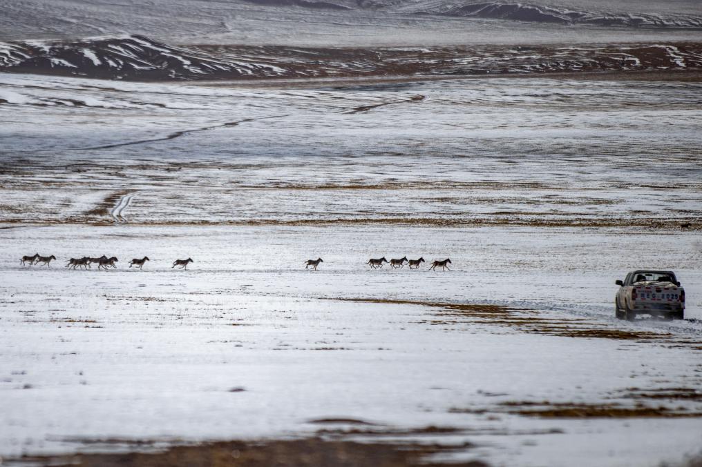 成群的藏野驢從野生動物專業(yè)管護隊員們的車前跑過(5月9日攝)。新華社記者 姜帆 攝