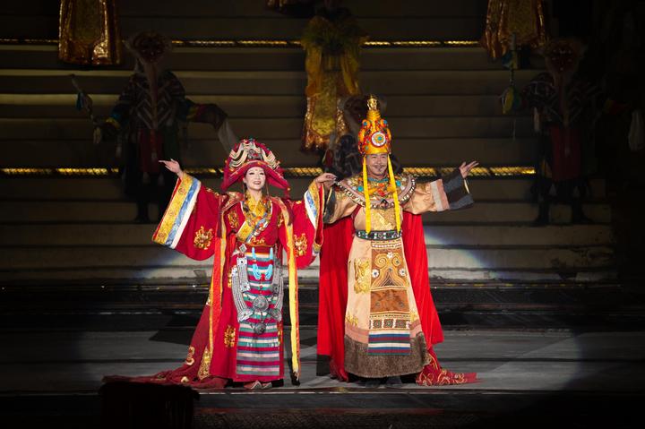 同一個夜晚,穿過近2000公里,在日光城拉薩,婉轉的唱段中,依山而建的舞臺上,大型史詩劇《文成公主》講述著盛唐時期公主從長安城到邏些(拉薩舊稱)的故事,一幅民族交往交流交融的歷史畫卷就此展開。