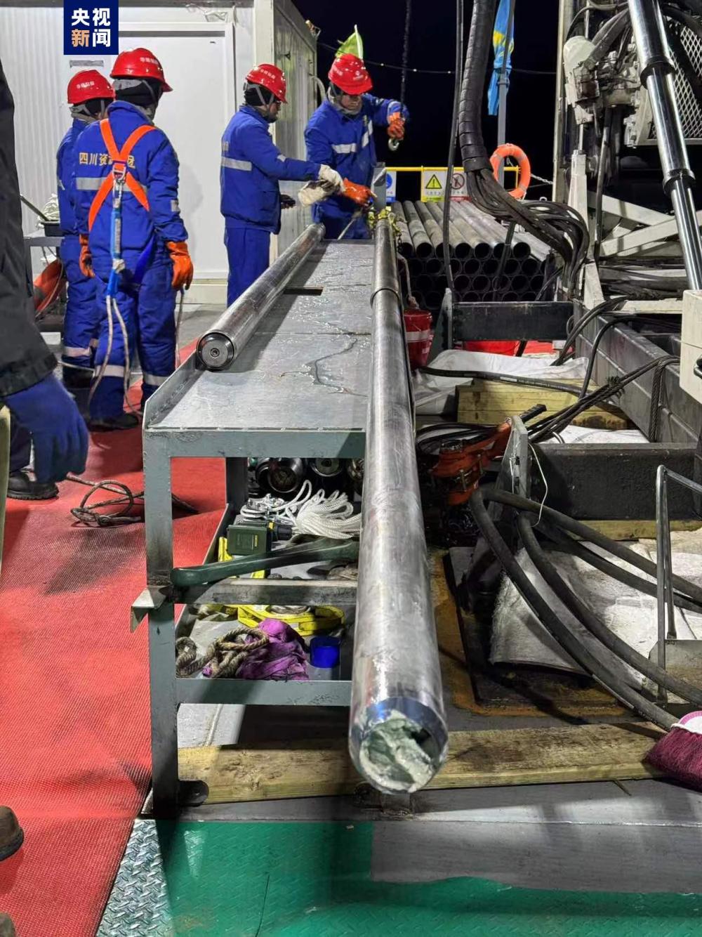 6月6日作為鉆芯的第一天,經過不斷地調整和試驗,當晚23時20分,第一次正式鉆探開始,鉆頭深入到了水下95米左右的位置,在第一個點位開始鉆取湖泊巖芯。23時40分,科考團隊獲得了第一批湖泊巖心樣本。科研團隊每次鉆取3米一段,通過24小時輪班不間斷作業(yè),截至7日早6時,已獲得9米長的巖芯。