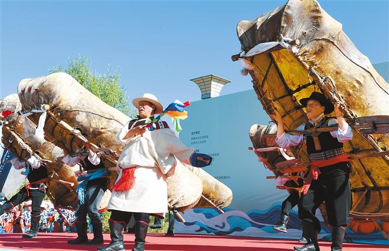 圖為在2024年西藏自治區(qū)端午節(jié)牛皮船(龍舟)賽開幕式上,群眾表演牛皮船舞。 旦增蘭澤 攝