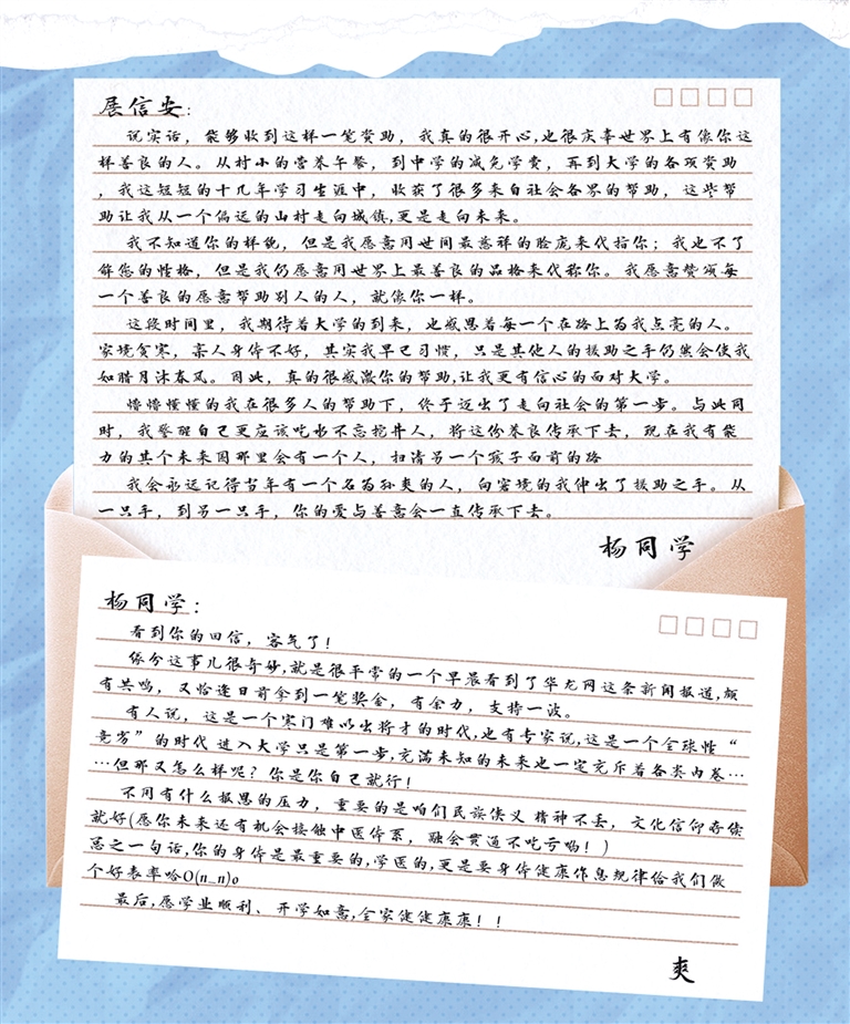 一位名叫葉珺的女生,看到江西勵志女孩佳琦的報道后,給這位千里之外素未謀面的“妹妹”寫了一封信,“我本來不輕易跟別人說自己的經(jīng)歷,但是看到佳琦的情況后特別感同身受,我覺得將自己的心聲傳達給這個小妹妹很有意義。”