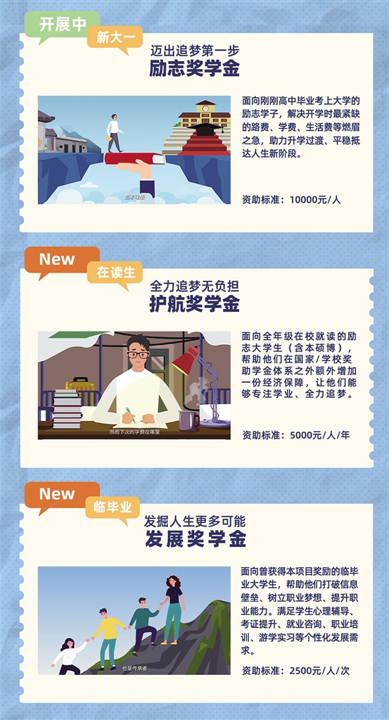 在這樣的背景下,今年夏天“勵志學子追夢計劃”升級為“夢想+”大學生助力計劃,項目模式從“一次性資助”升級為“全學段全方位幫助”,即在繼續(xù)幫助大一勵志學子過渡升學的基礎(chǔ)上,增加了對在讀大學生的持續(xù)幫助、臨畢業(yè)生的自我提升就業(yè)幫助等,希望能夠助力勵志學子們更從容自信地迎接新生活、新挑戰(zhàn),全面發(fā)展,勇敢追夢。