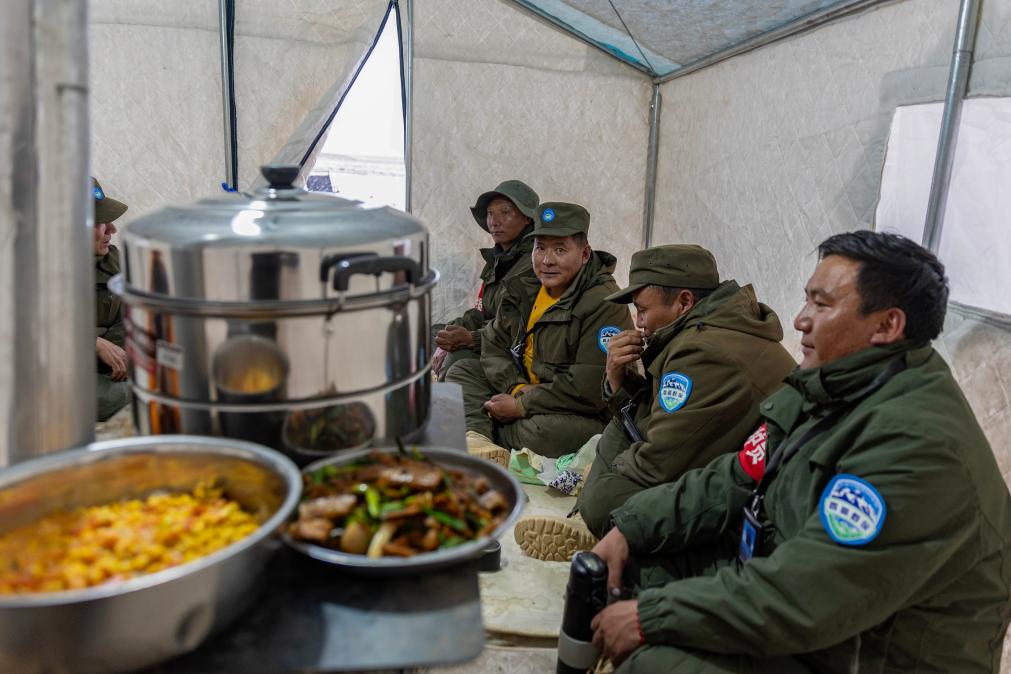 野生動(dòng)物專業(yè)管護(hù)隊(duì)員們?cè)谘沧o(hù)途中宿營的帳篷內(nèi)準(zhǔn)備吃飯(5月7日攝)。新華社記者 姜帆 攝