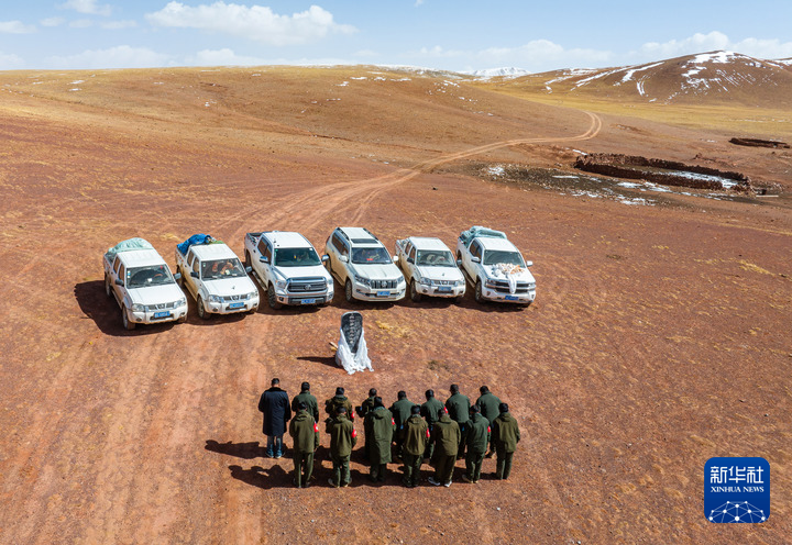 野生動物專業(yè)管護隊員們在無人區(qū)深處的羅布玉杰烈士紀念碑前默哀致敬(無人機照片,5月10日攝)。 新華社記者 姜帆 攝